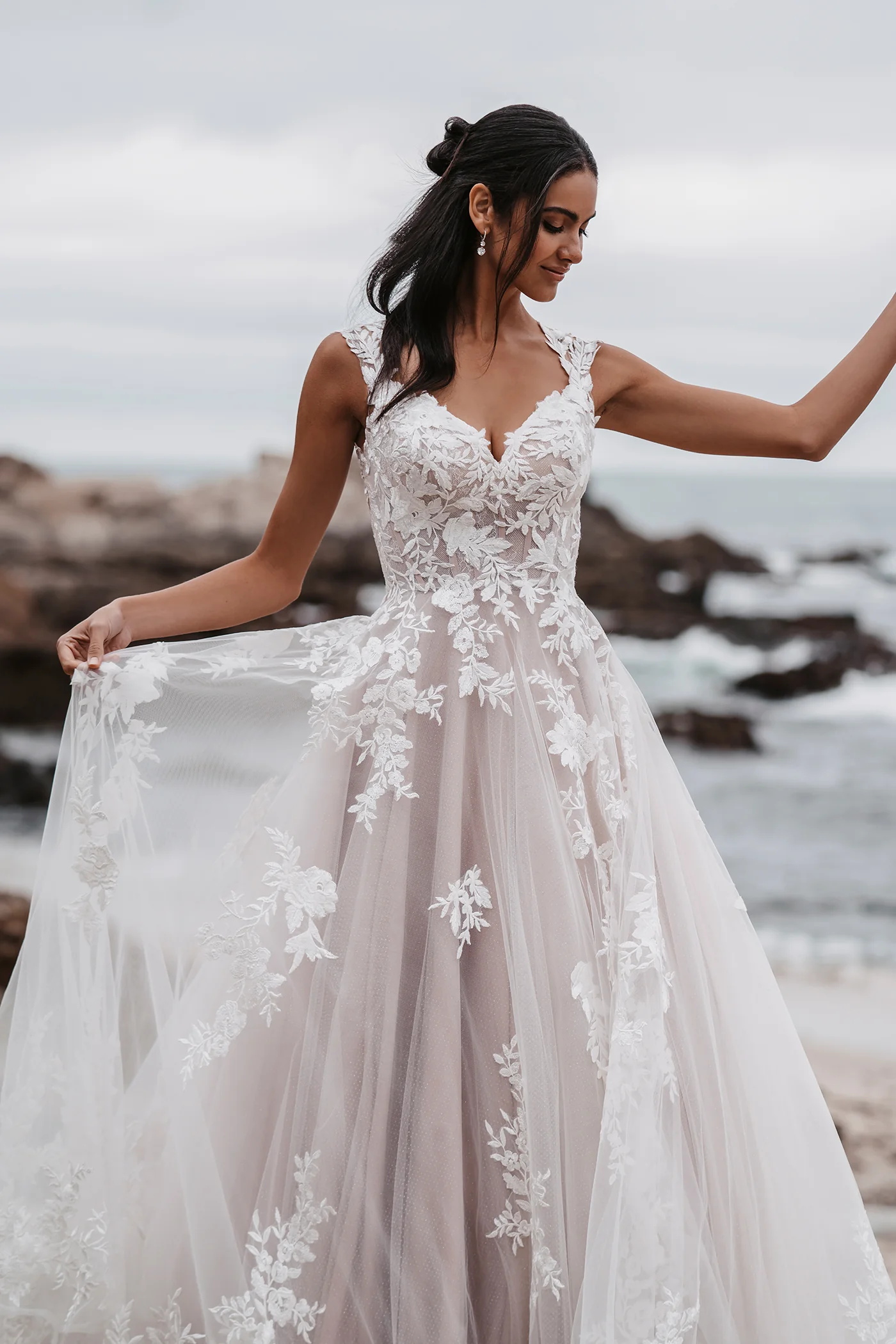 Delicate illusion cap sleeves balance the sweetheart bodice of this timeless, shimmering lace ballgown.