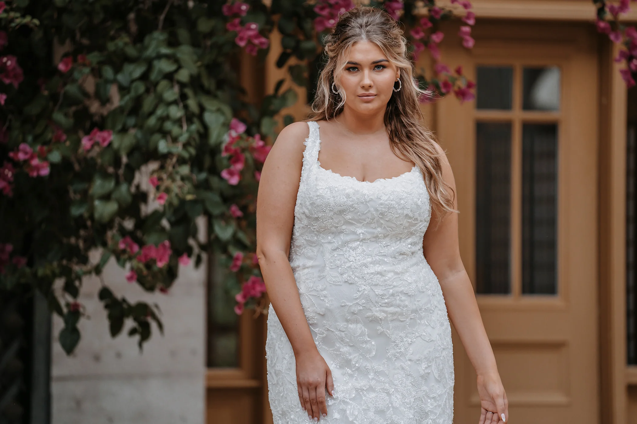 An elegant squared neckline accents the silhouette of this sleeveless lace gown.
