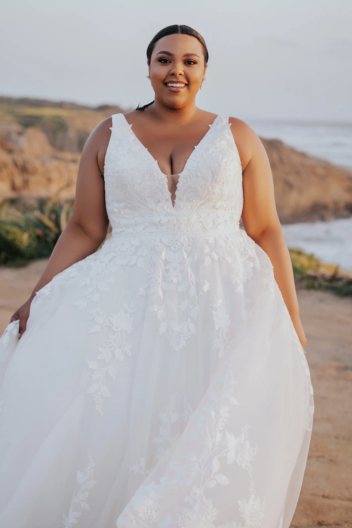 This A-line tulle gown features matte lace appliques and a delicate beaded waistband.