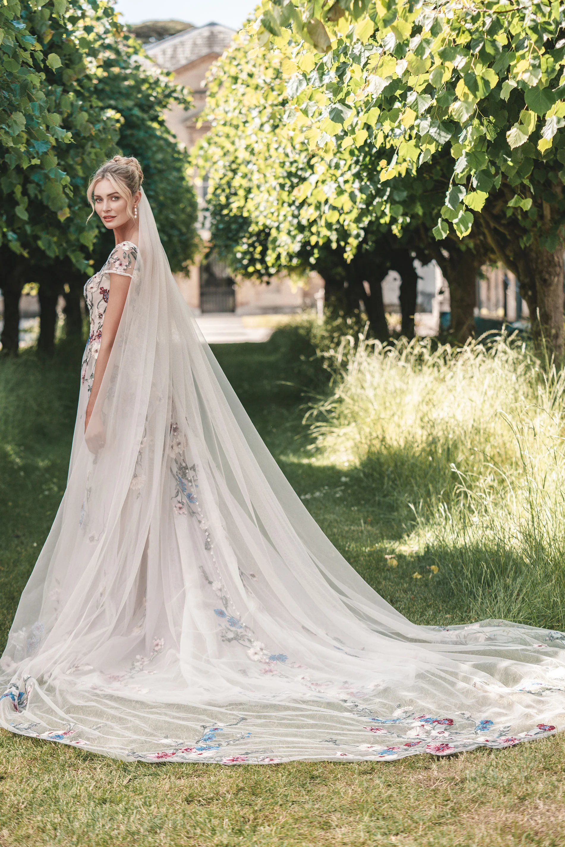 Embroidered lace blossoms adorn the hemline of this romantic tulle veil.