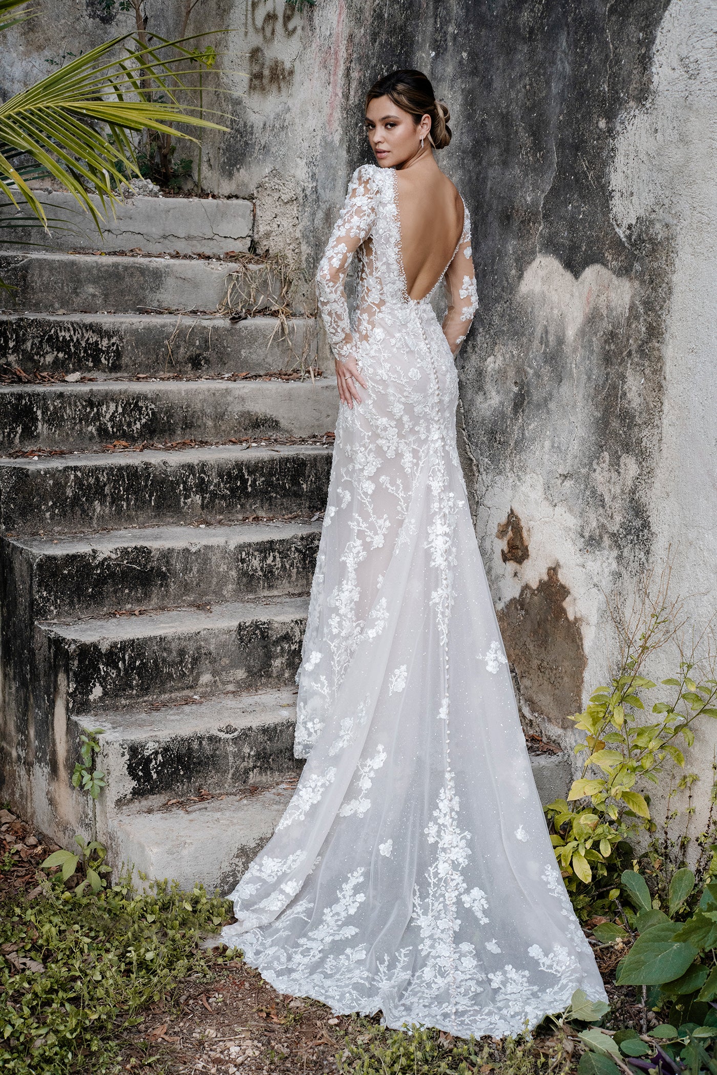 A vintage-inspired silhouette brings ever-so-slightly puffed long sleeves and a plunging neckline and back to this opulent gown.