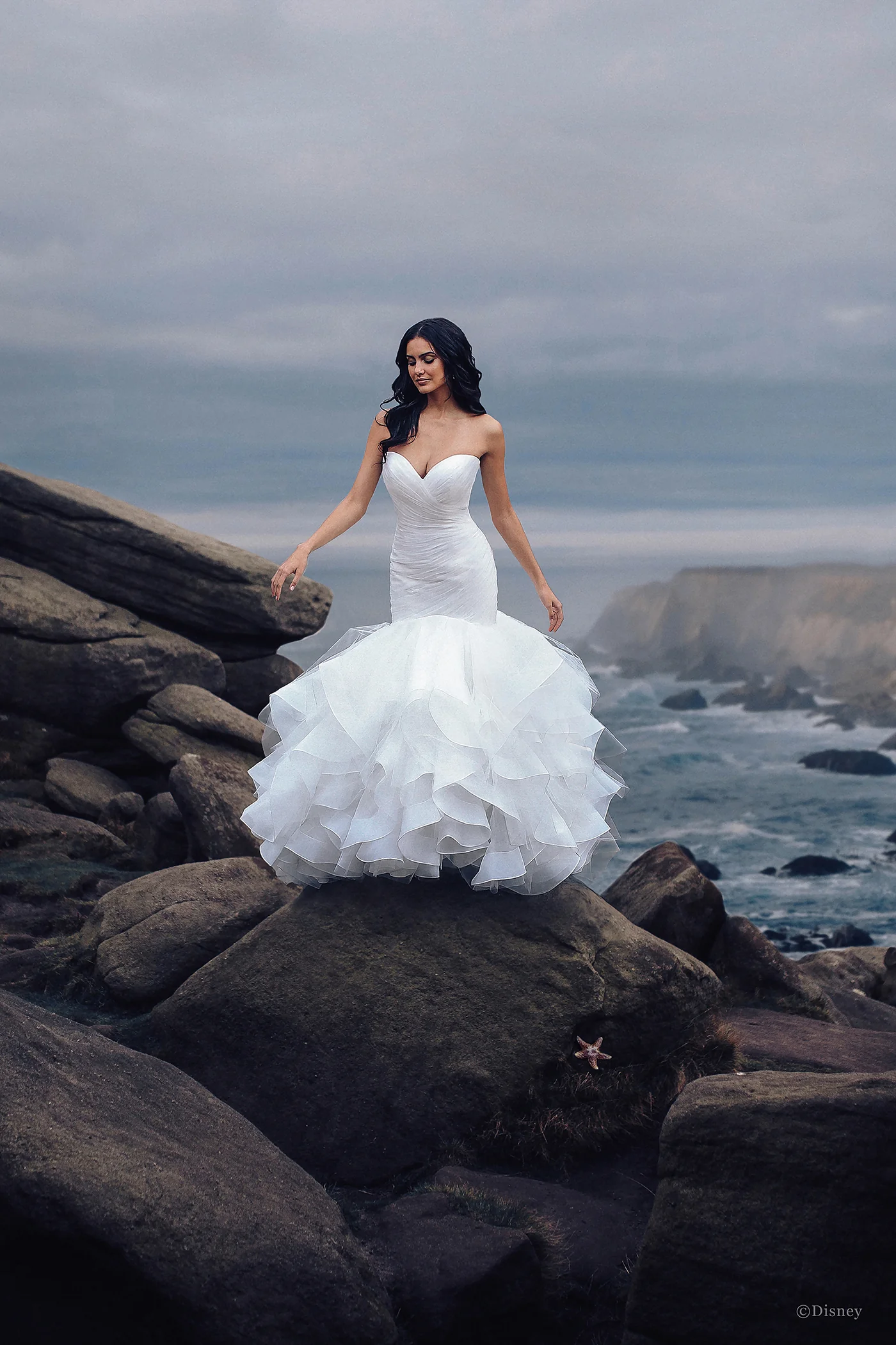Our Ariel mermaid style gown is truly inspired. Cascading layers of soft tulle and organza invoke the rolling waves of the ocean. Ruching on the strapless, sweetheart neckline is feminine and flattering. Like a long strand of pearls, beautiful covered buttons down the back of this gown create a dramatic effect.