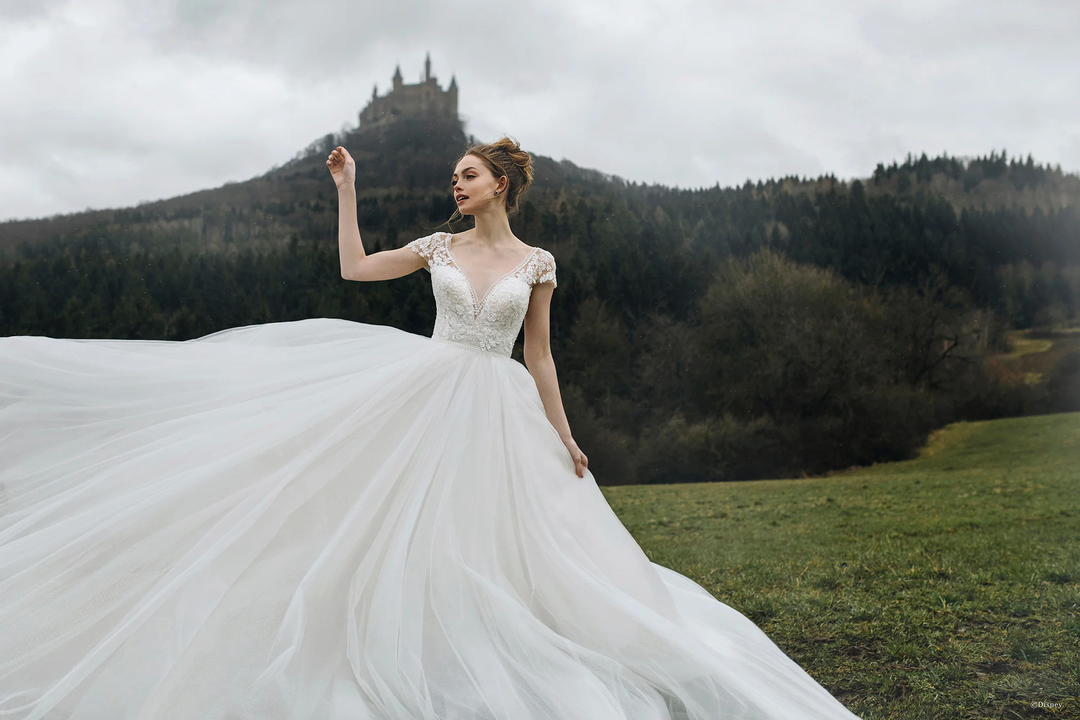 Our Cinderella inspired gown features a dramatic v-shaped bodice adorned with hundreds of crystals, and Alencon lace appliques. Lovely capped sleeves add feminine glamour and the shimmering, sparkling tulle within the skirt illuminates this enchanting ballgown making it transformation ready.