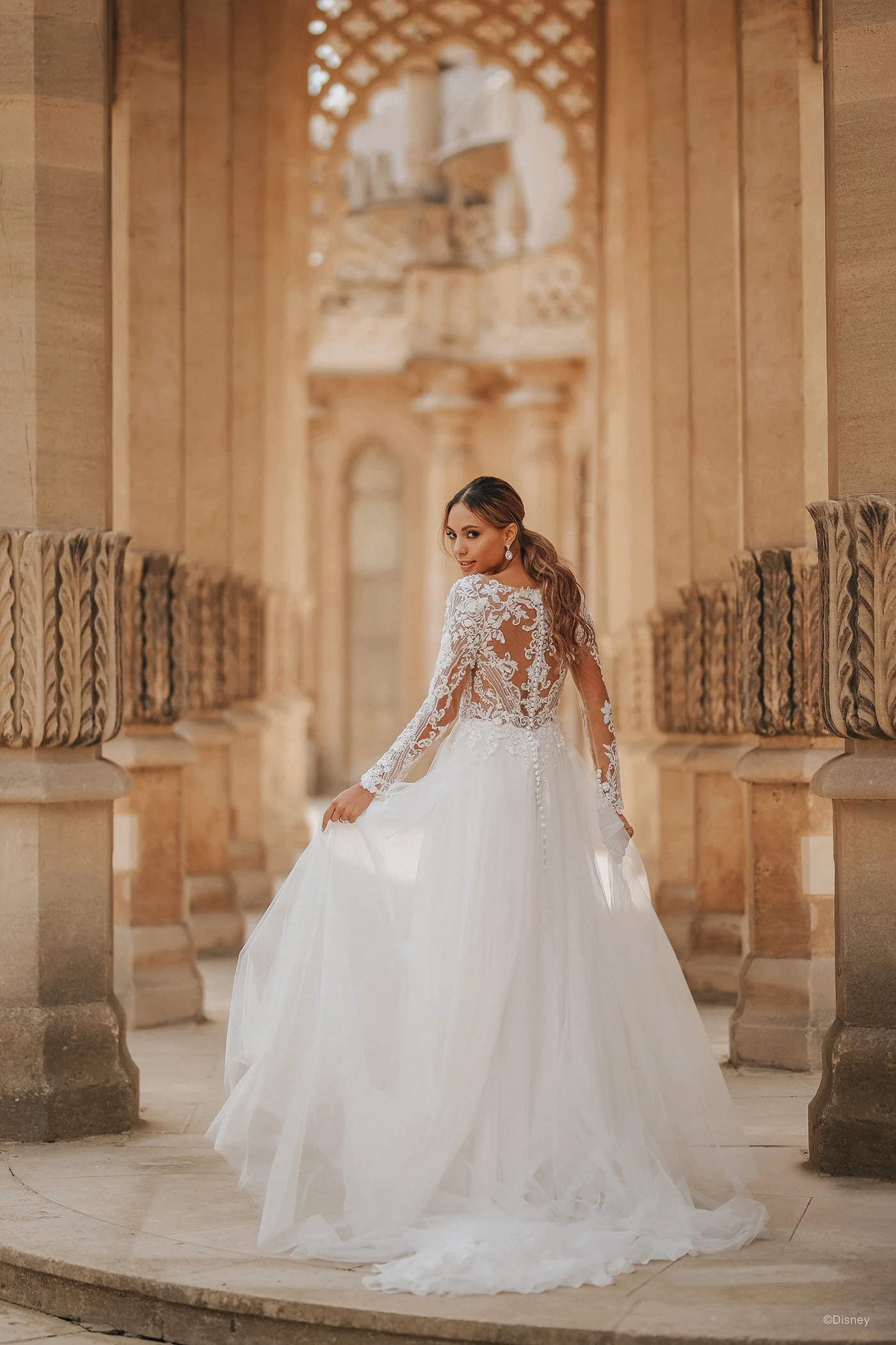 Paying tribute to the 30th anniversary of Disney's “Aladdin,” this gown reflects Jasmine's confidence — with a long sleeved bodice featuring tonal beading, dimensional blooms, and dramatic embroidery, beautifully balanced with an enchanting soft A-line tulle skirt.