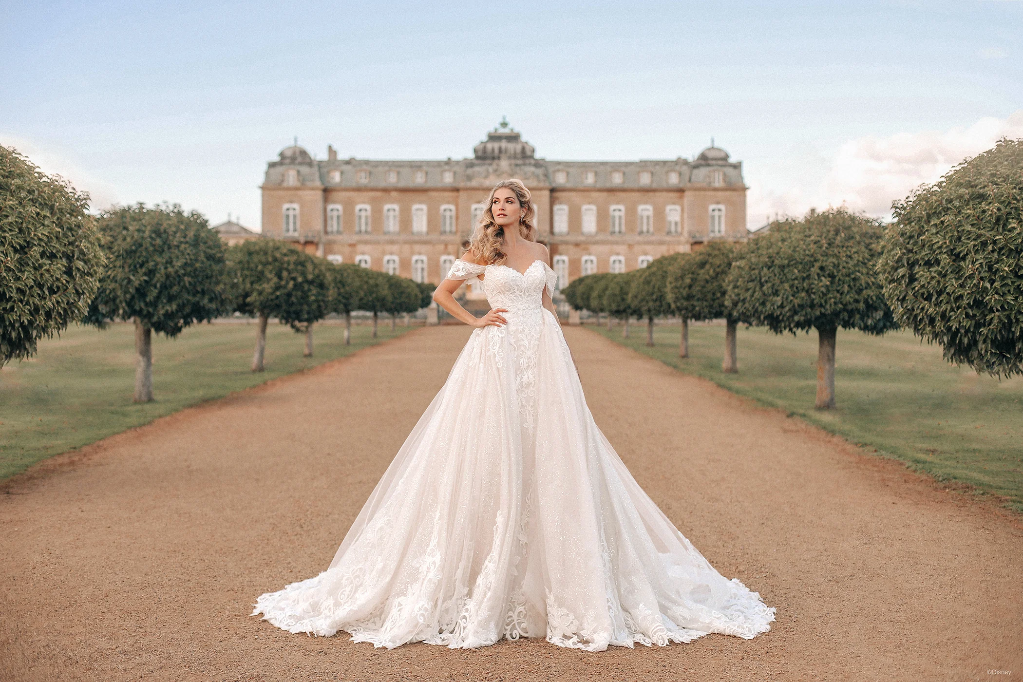 The Cinderella Platinum detachable train, composed of gorgeous scattered sequin sparkle tulle with carriage inspired beaded lace appliqués truly transform the look.