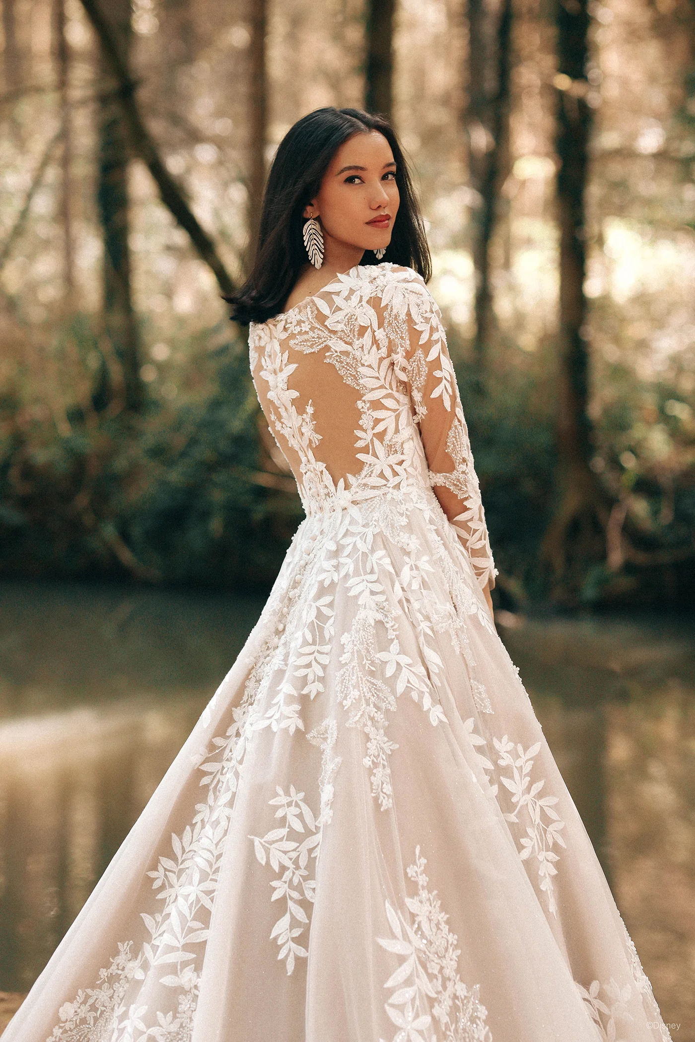 Inspired by nature, the Pocahontas Platinum gown features delicately strewn patterned leaf appliques throughout, stunning illusion sleeves and matching v-neck and open back.