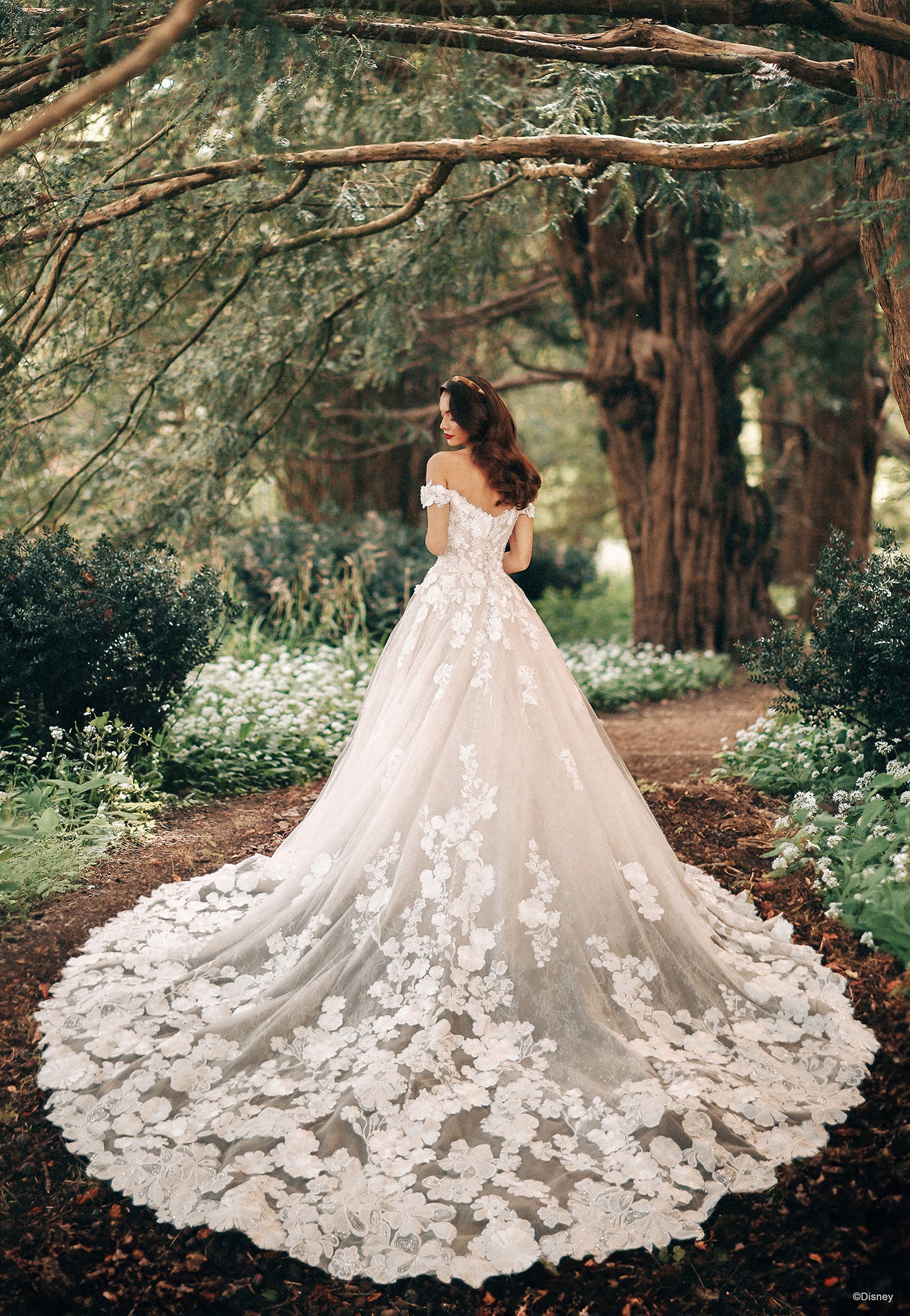 This ballgown draws its design inspiration from the forest surrounding the princess. Off-shoulder cap sleeves and sweetheart bodice of the gown, pooling beautifully at the hemline and giving the illusion of a fallen storm of apple blossoms.