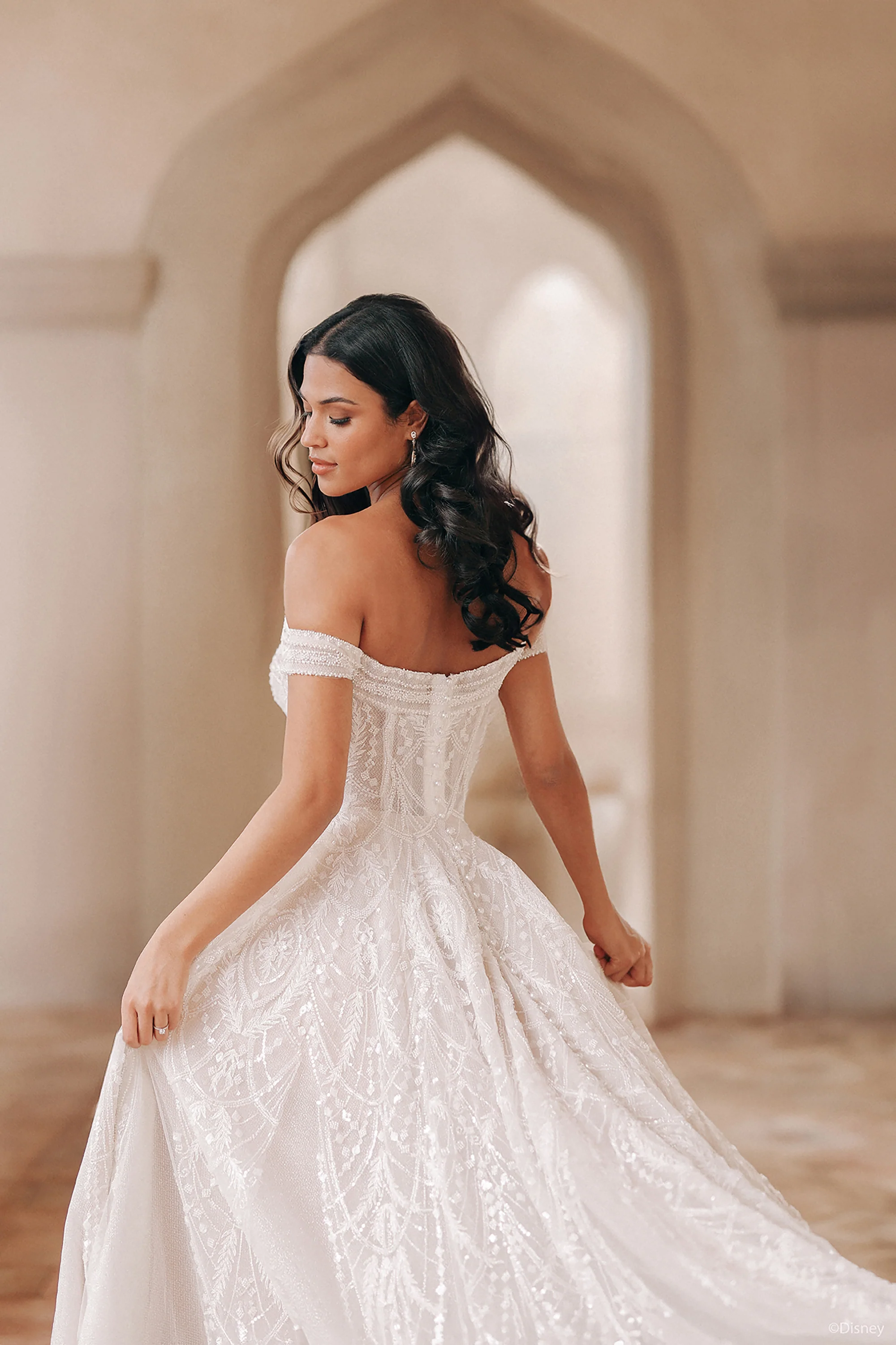 Inspired by Jasmine’s adventurous heart, this enchanting ballgown features a sophisticated straight neckline and off-the-shoulder sleeves. The natural waistline, adorned with intricate beading and sequins, glimmers over layers of swiss dot tulle, adding a touch of magic. Available in rich mocha and gold, this gown evokes Jasmine’s royal heritage and the opulence of Agrabah, blending warmth with a hint of bohemian allure. Perfect for the bride who dreams of a whole new world and a happily ever after that’s the greatest adventure of all, this gown is a tribute to Jasmine’s timeless beauty and spirit of wanderlust. Pictured with matching veil, DV44, sold separately.Â