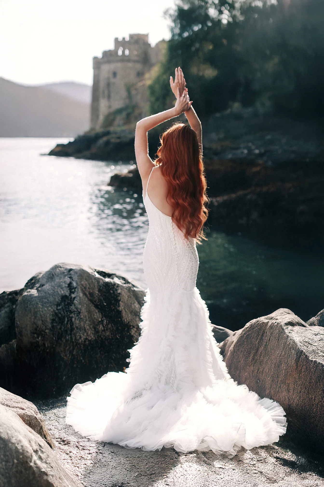Inspired by Ariel’s journey beyond the sea, this mermaid-fit gown shimmers with the spirit of adventure and transformation. The bodice glistens with intricate beading and pearls, reminiscent of sunlight dancing across the ocean’s surface, while the ruffled tulle skirt flows like gentle waves meeting the shore. A tribute to Ariel’s courage and curiosity, this gown captures the moment she follows her heart toward a world waiting to be discovered.