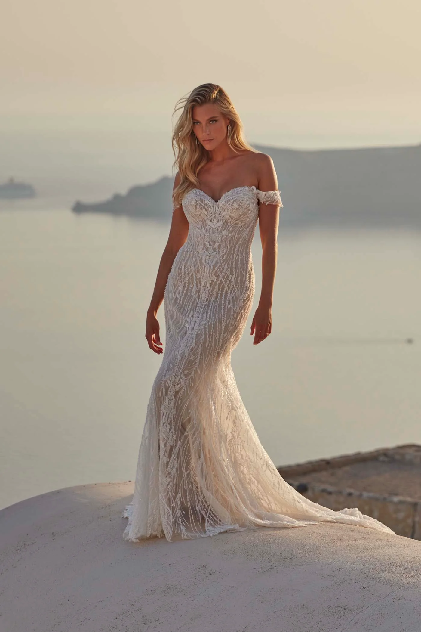 Introducing Flavia: an opulent off-shoulder sheath gown embellished with beaded, sequined and pearl lace appliques.